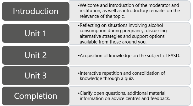 - Alternative skills/strategies for dealing with alcohol consumption during pregnancy are developed and social skills are trained in order to avoid alcohol consumption in difficult everyday situations and to support pregnant women in abstaining from alcohol.